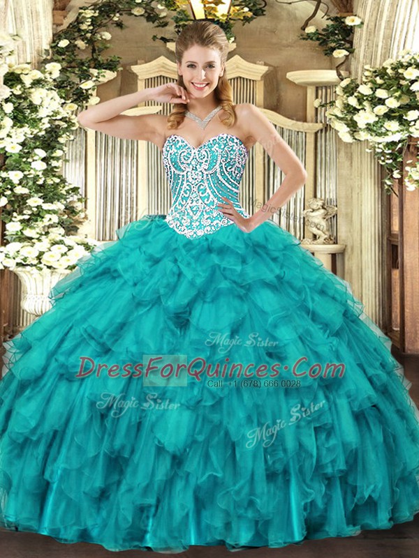 Most Popular Teal Lace Up Sweetheart Beading and Ruffles Quinceanera Gowns Tulle Sleeveless