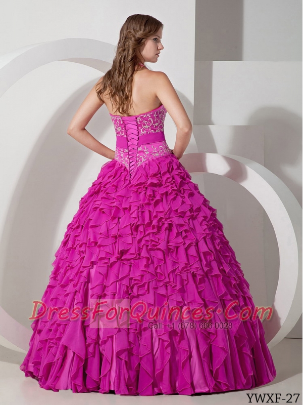 New Styles Ball Gown Halter With Chiffon Embroidery Quinceanera Dress