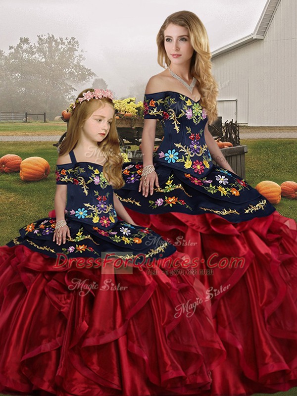 Popular Red And Black Lace Up Sweet 16 Dress Embroidery and Ruffles Sleeveless Floor Length