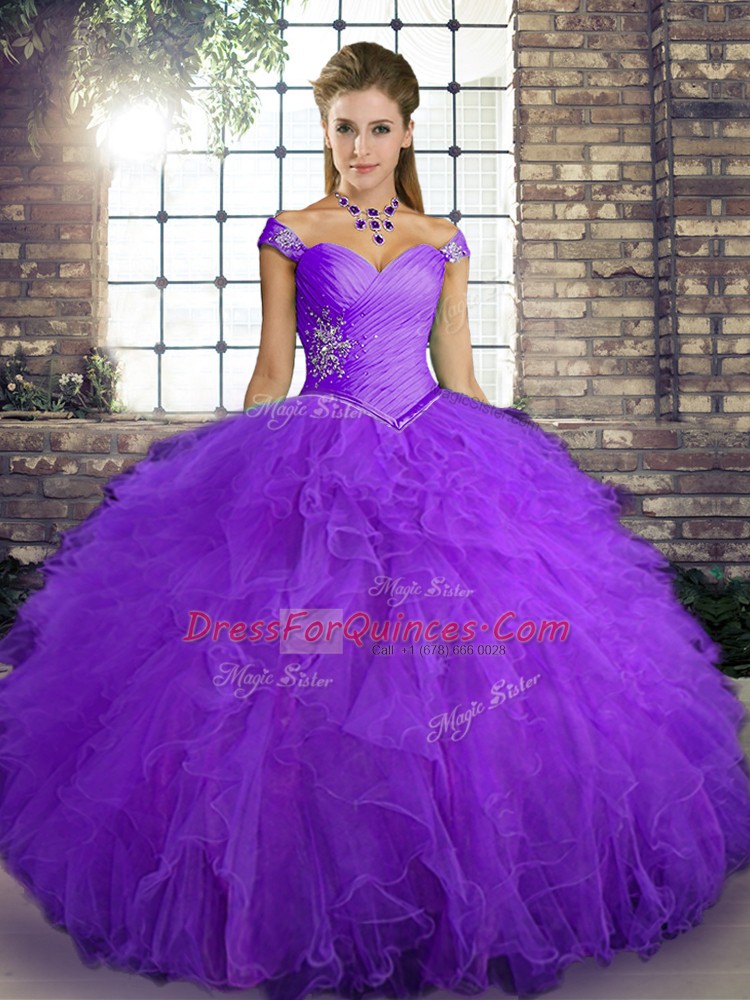 Pretty Purple Tulle Lace Up Quinceanera Dress Sleeveless Floor Length Beading and Ruffles