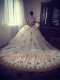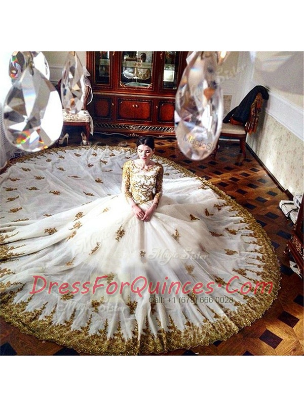 Scoop White Ball Gowns Appliques Vestidos de Quinceanera Zipper Tulle Long Sleeves With Train