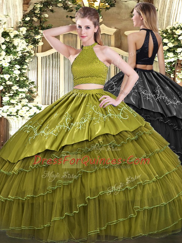 Sleeveless Organza Floor Length Backless 15 Quinceanera Dress in Olive Green with Beading and Embroidery and Ruffled Layers