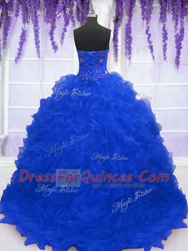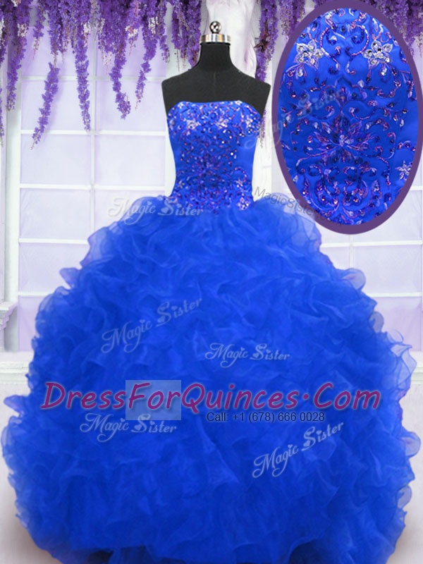 Strapless Sleeveless Organza 15 Quinceanera Dress Beading and Ruffles Brush Train Lace Up