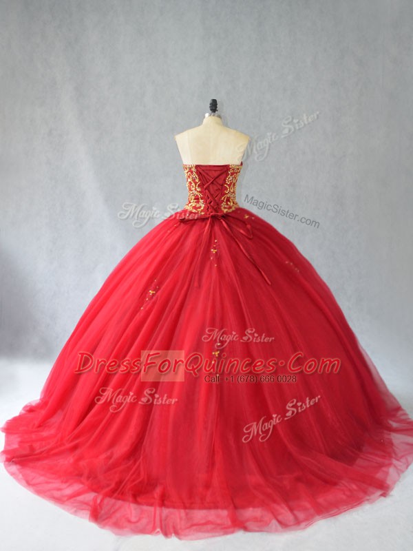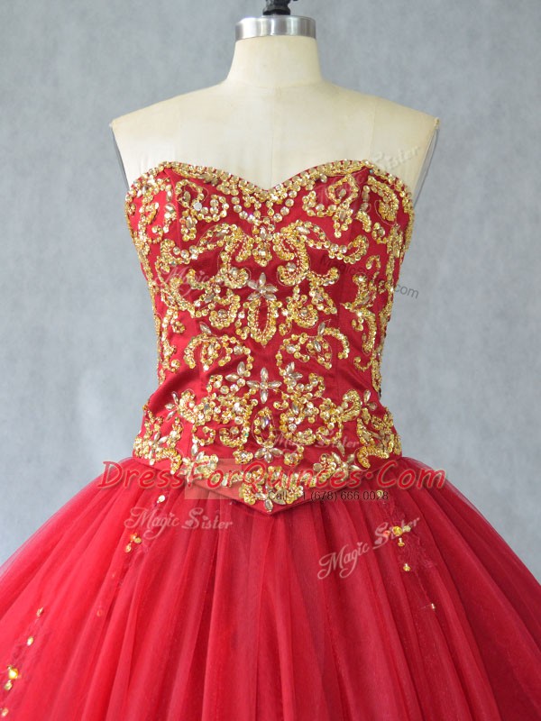 Stunning Red Ball Gowns Tulle Sweetheart Sleeveless Beading Lace Up Quinceanera Gowns Brush Train