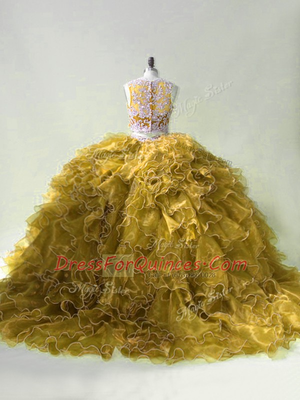 Superior Olive Green Zipper Scoop Beading and Ruffles Sweet 16 Quinceanera Dress Organza Sleeveless Brush Train