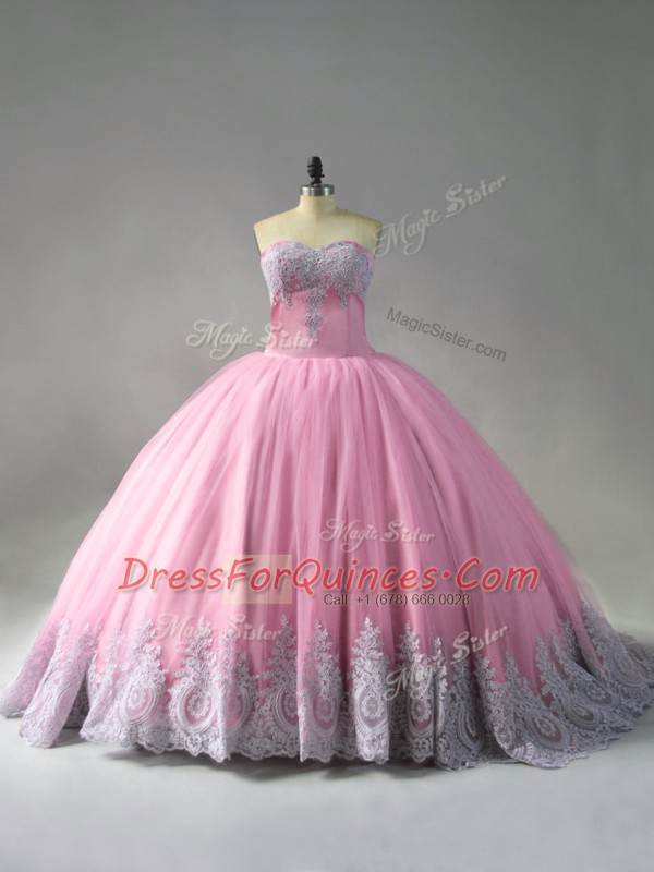 Sweetheart Sleeveless Court Train Lace Up Ball Gown Prom Dress Pink Tulle