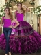 Trendy Halter Top Sleeveless Quinceanera Dress Floor Length Embroidery and Ruffles Fuchsia Organza