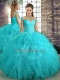 Trendy Sleeveless Tulle Floor Length Lace Up Quinceanera Gowns in Aqua Blue with Beading and Ruffles