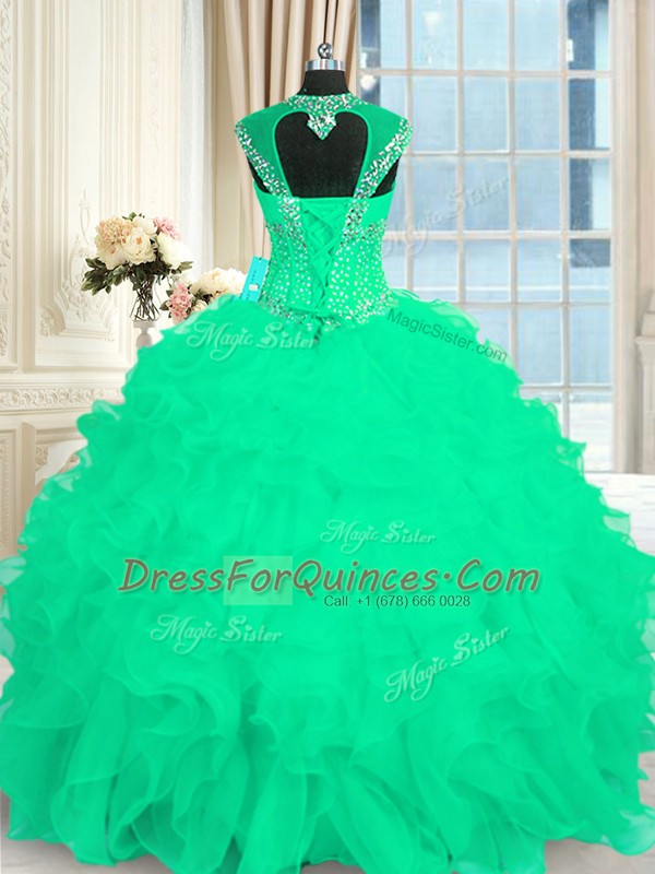 Turquoise Cap Sleeves Beading and Ruffles and Pattern Floor Length Ball Gown Prom Dress