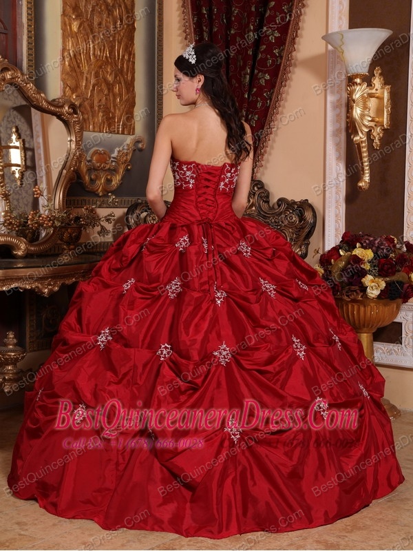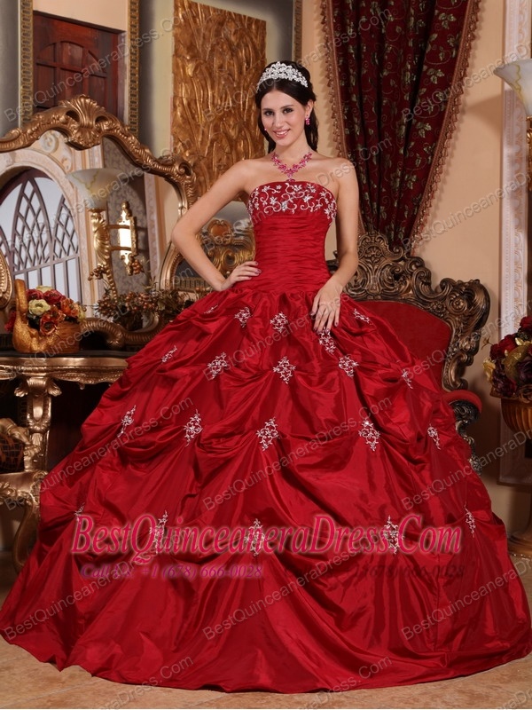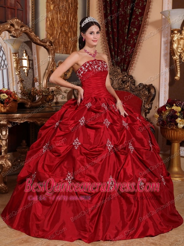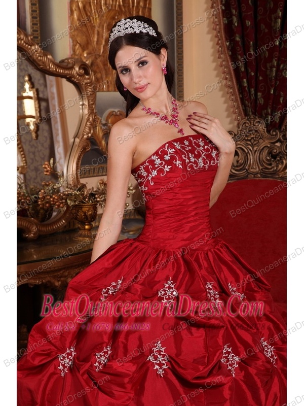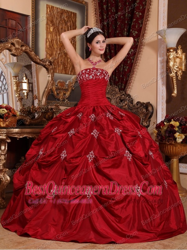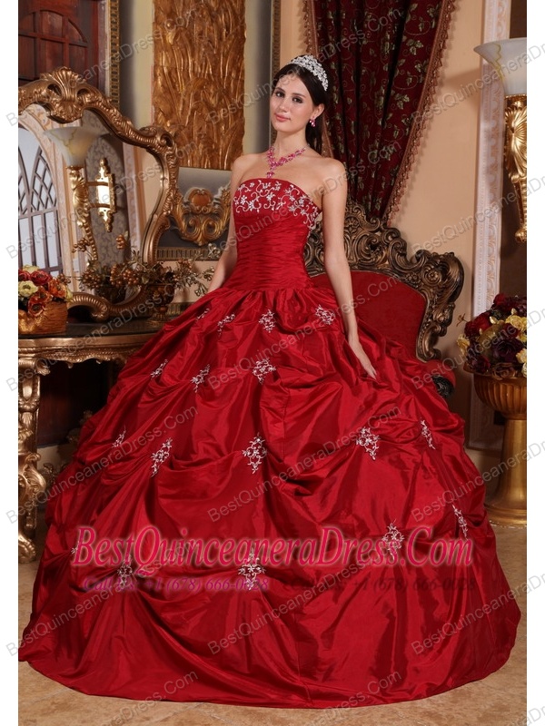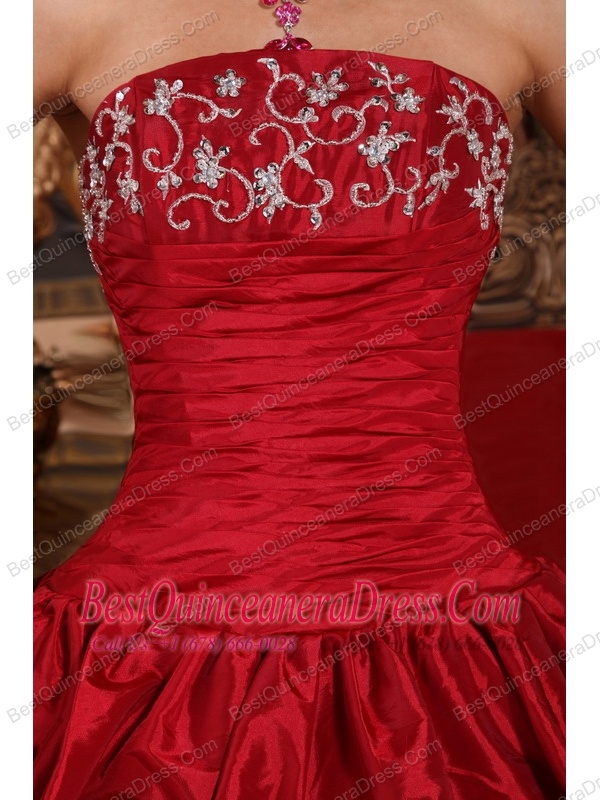 Wine Red Ball Gown Strapless Floor-length Taffeta Appliques Quinceanera Dress
