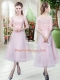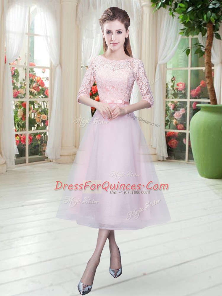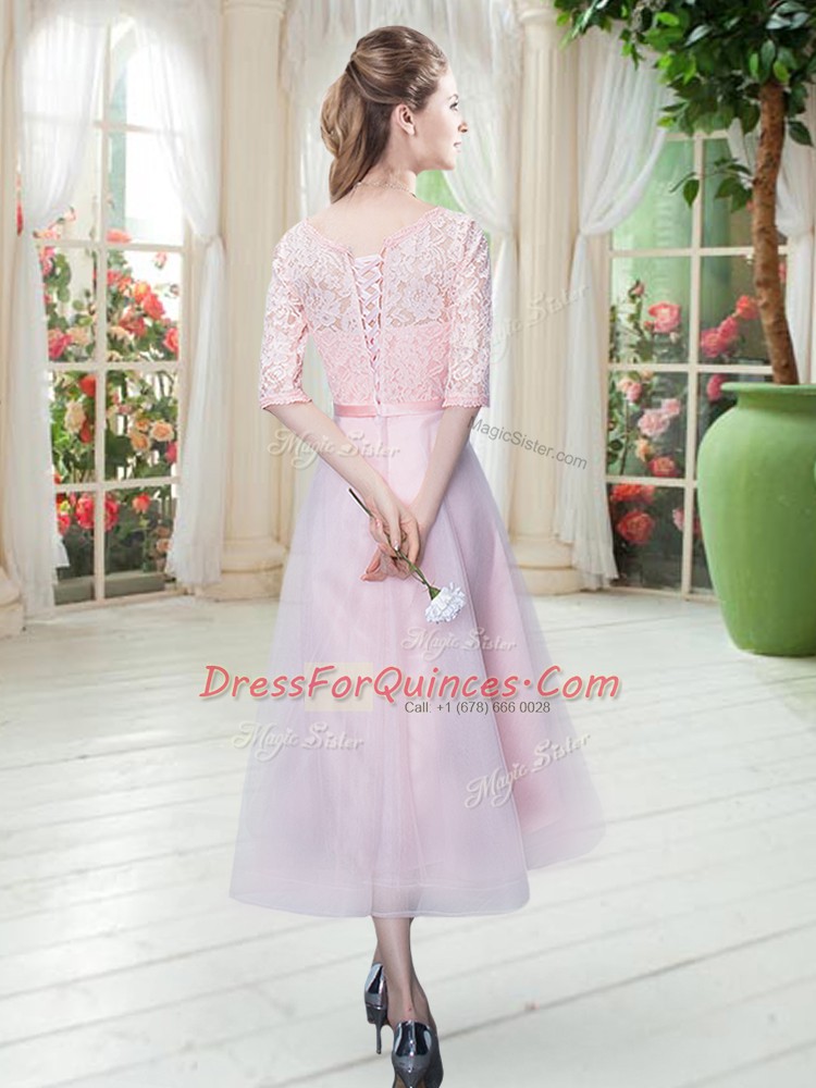 Baby Pink A-line Scoop Half Sleeves Ankle Length Lace Up Belt Homecoming Dress