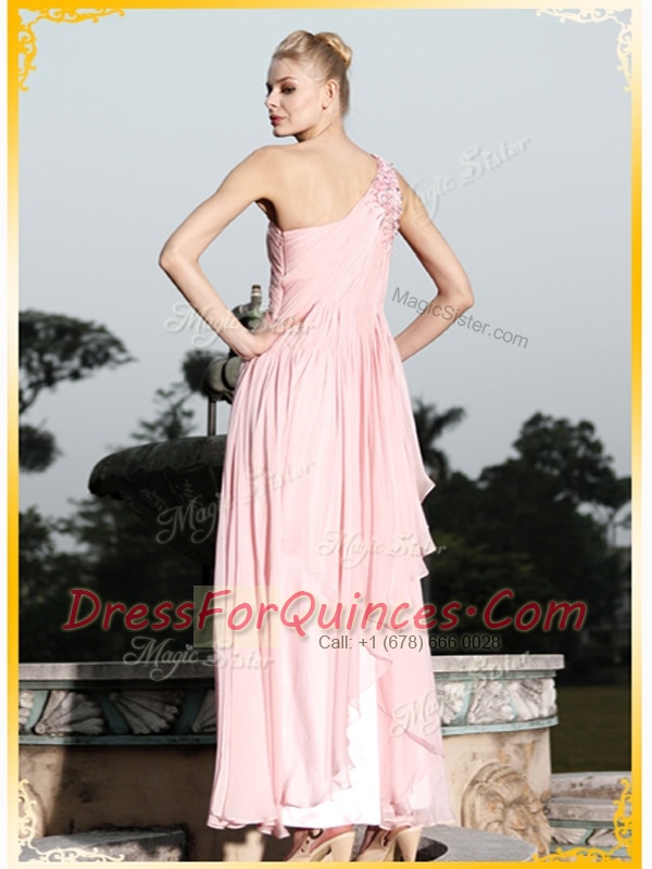 Baby Pink Chiffon Side Zipper One Shoulder Sleeveless Floor Length Prom Evening Gown Ruching and Hand Made Flower