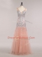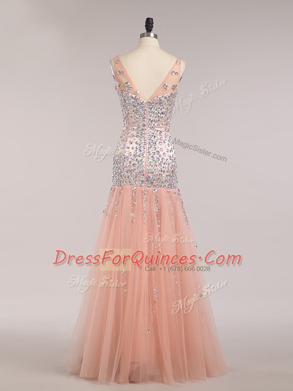 Beading and Sequins Prom Dress Peach Zipper Sleeveless Floor Length