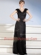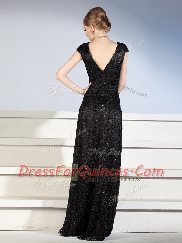 Black Lace Side Zipper Prom Evening Gown Cap Sleeves With Brush Train Beading and Lace