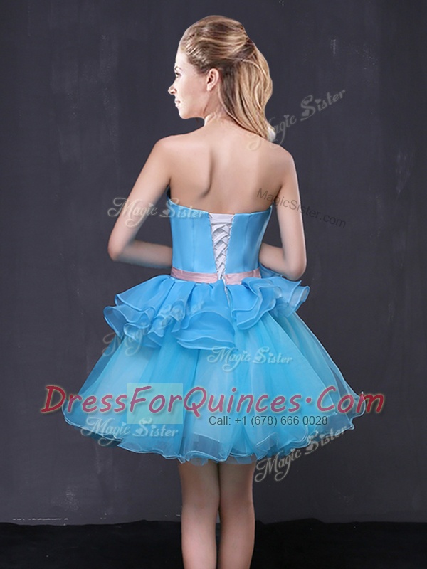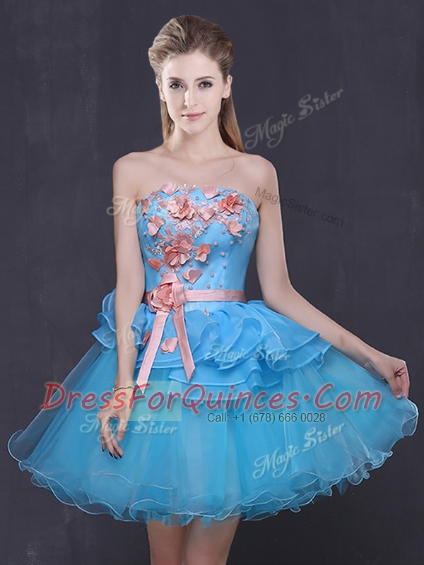 Blue A-line Tulle Strapless Sleeveless Hand Made Flower Mini Length Lace Up Prom Evening Gown