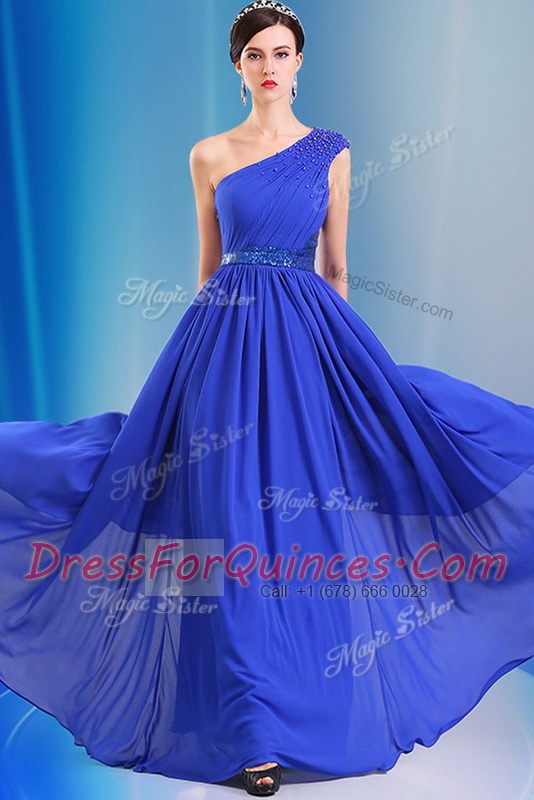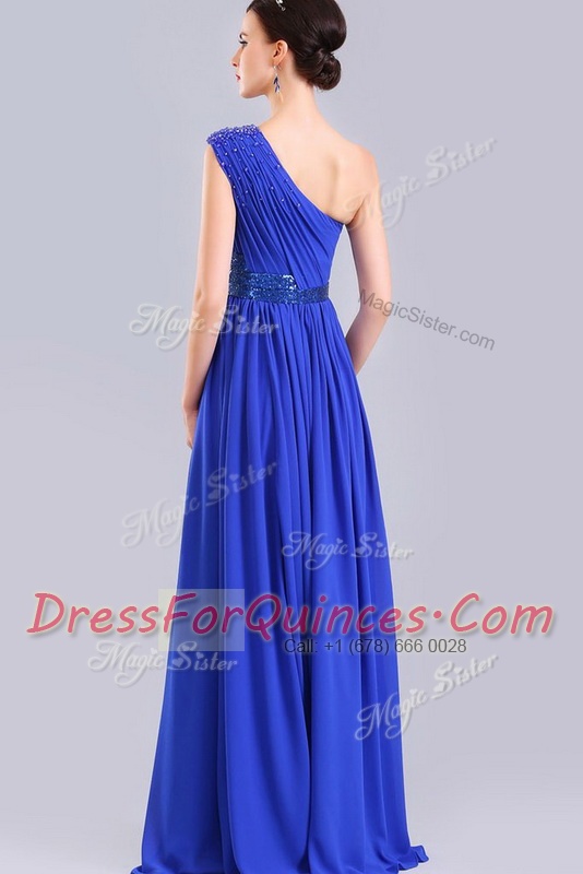 Classical One Shoulder Royal Blue Sleeveless Chiffon Side Zipper for Prom and Party