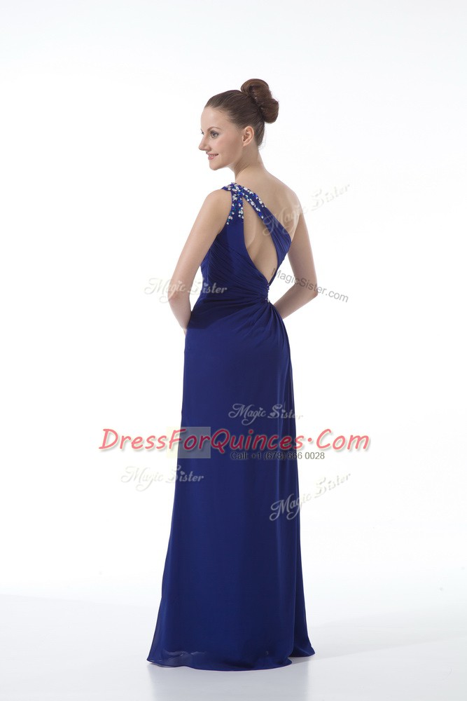 Customized Beading and Ruching Prom Dress Royal Blue Backless Sleeveless Floor Length