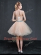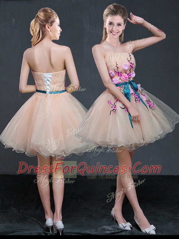 Customized Peach A-line Strapless Sleeveless Organza Mini Length Lace Up Appliques and Belt Dress for Prom