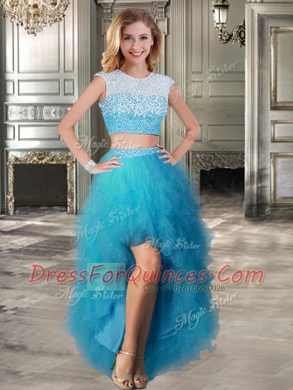 Deluxe Scoop Cap Sleeves Tulle High Low Lace Up in Teal with Beading and Ruffles
