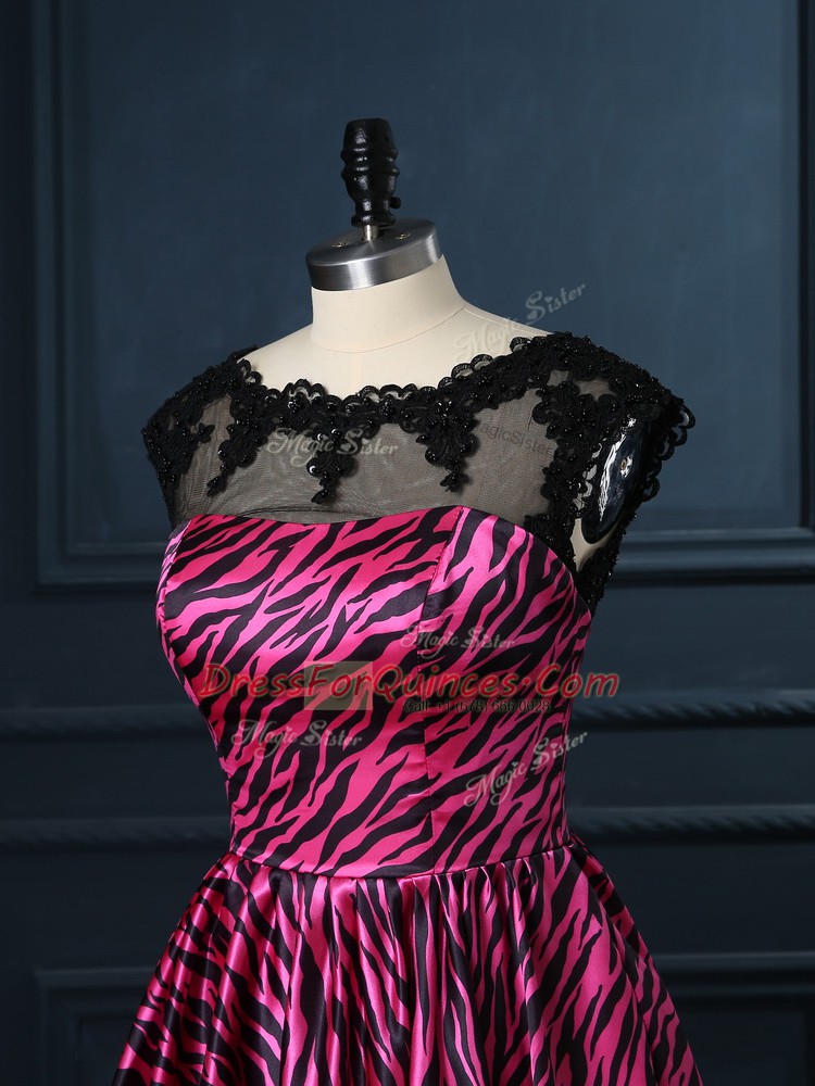 Fashion Scoop Cap Sleeves Backless Dress for Prom Hot Pink Printed