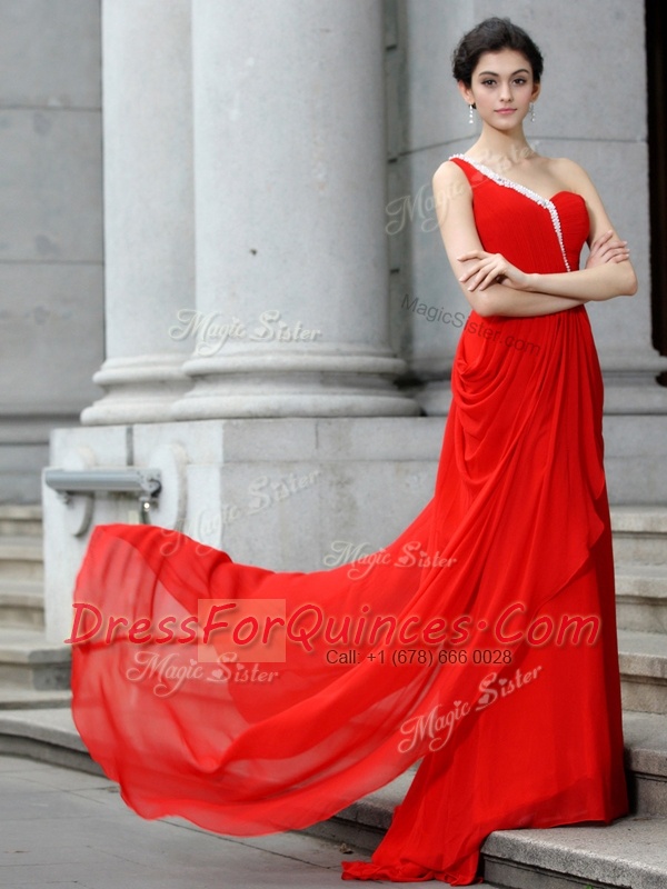 Flare One Shoulder Red Chiffon Zipper Prom Party Dress Sleeveless With Brush Train Beading and Ruching