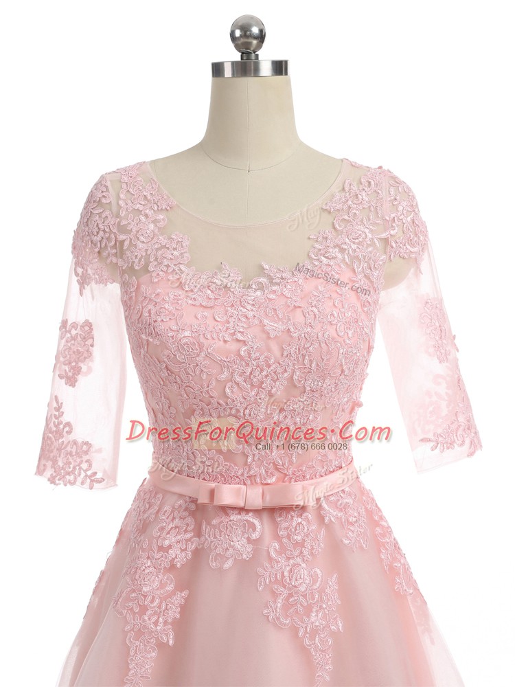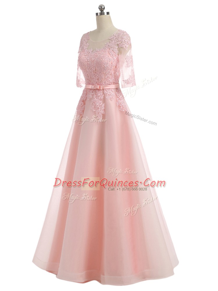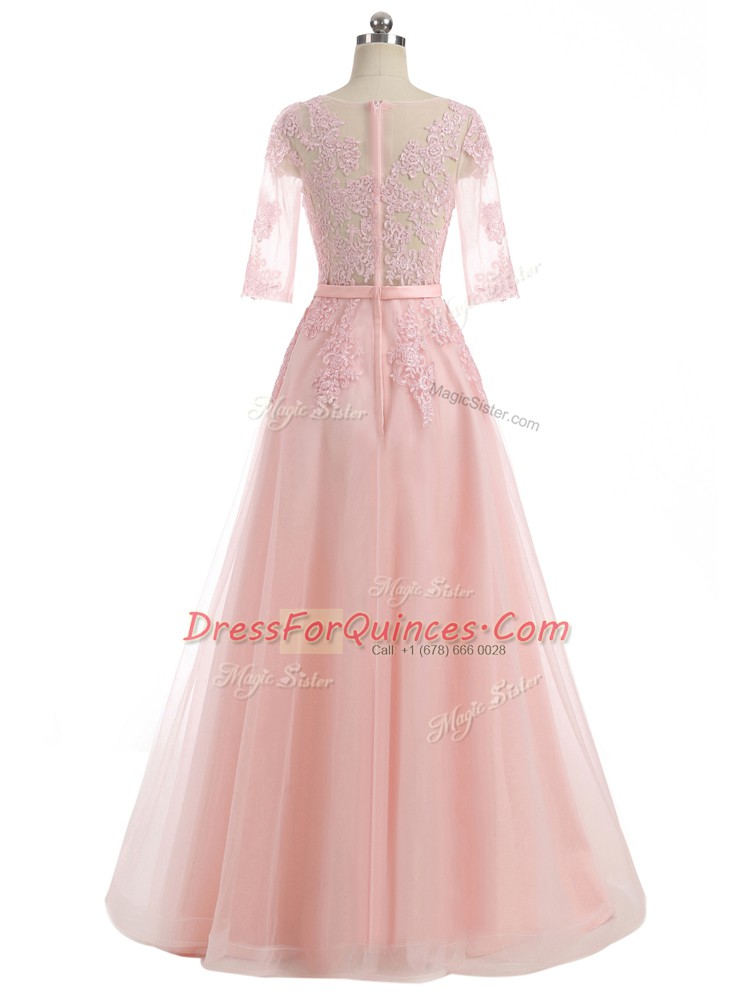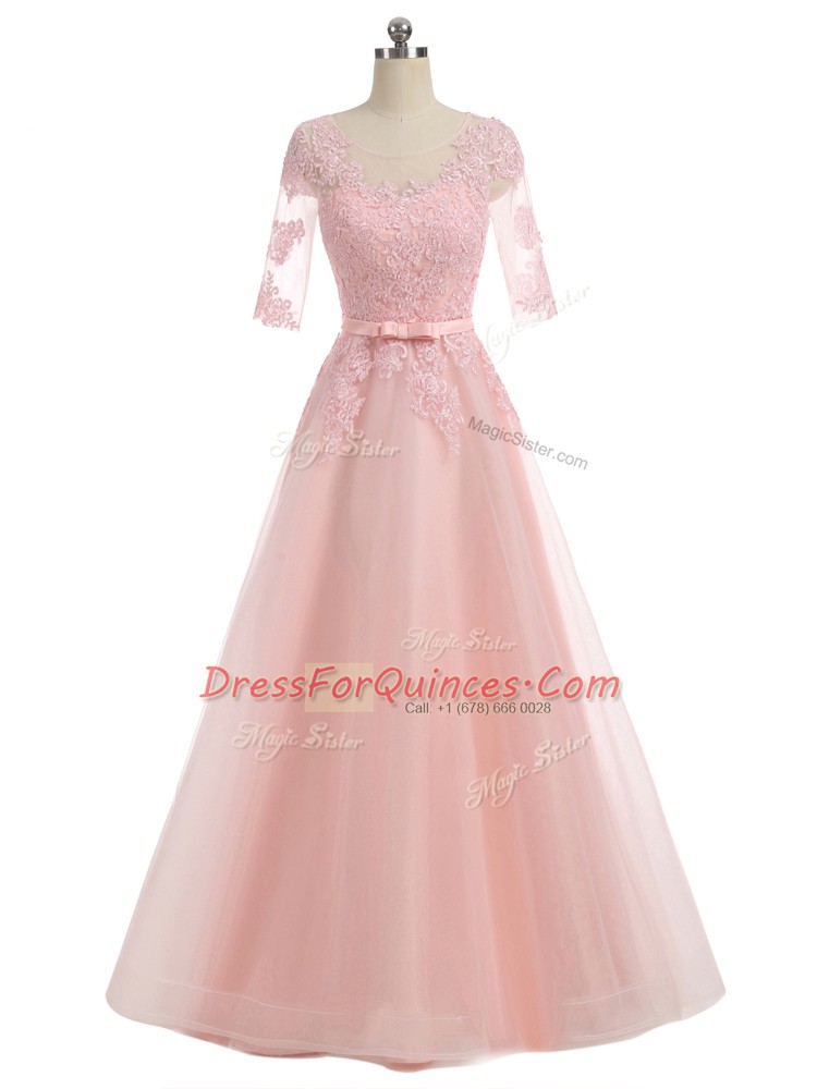 Flirting Floor Length A-line Short Sleeves Pink Prom Evening Gown Zipper