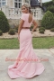 Flirting Mermaid Scoop Sleeveless Satin Sweep Train Backless Prom Gown in Rose Pink with Ruching