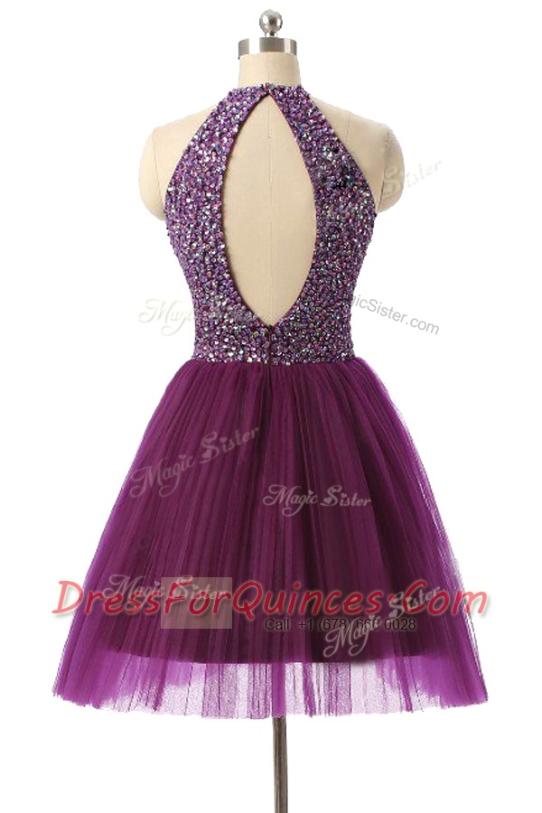 Halter Top Purple Sleeveless Knee Length Sequins Zipper Prom Dresses