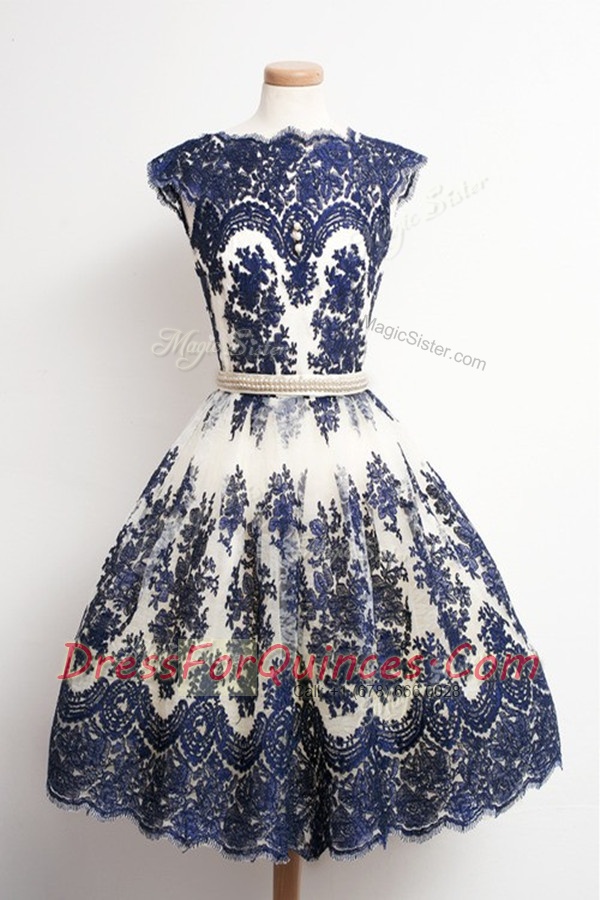 Hot Sale Scalloped Cap Sleeves Tulle Knee Length Zipper in Navy Blue with Appliques