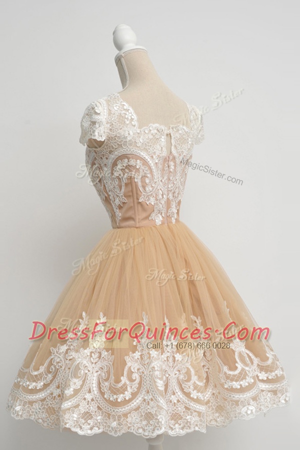 Knee Length Champagne Prom Gown Scoop Cap Sleeves Zipper