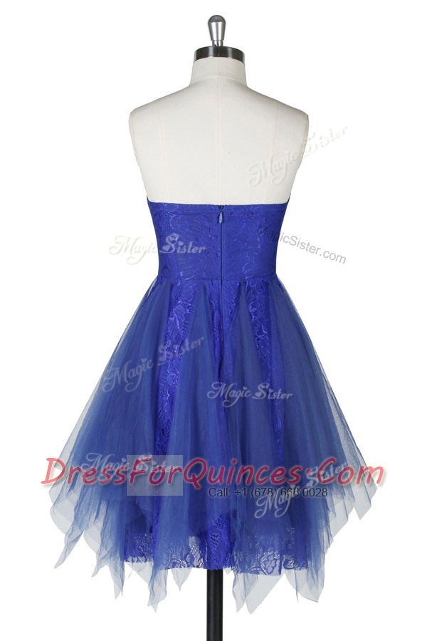 Lace Royal Blue Zipper Prom Dress Belt Sleeveless Knee Length