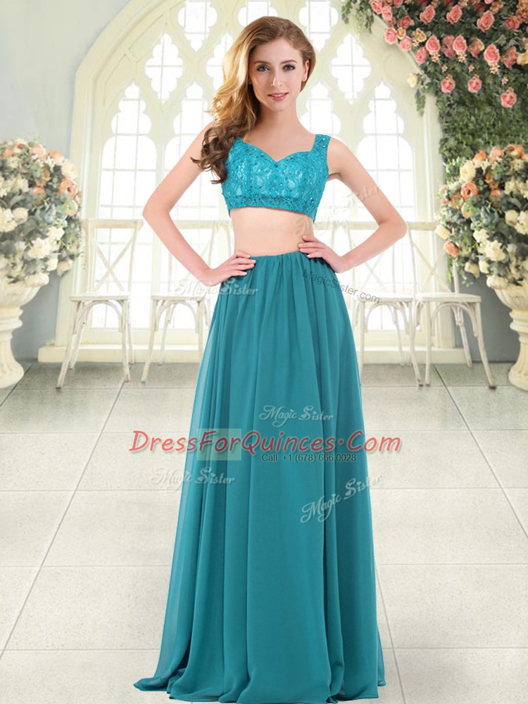Modern Teal Prom Evening Gown Prom and Party with Beading and Lace Straps Sleeveless Zipper