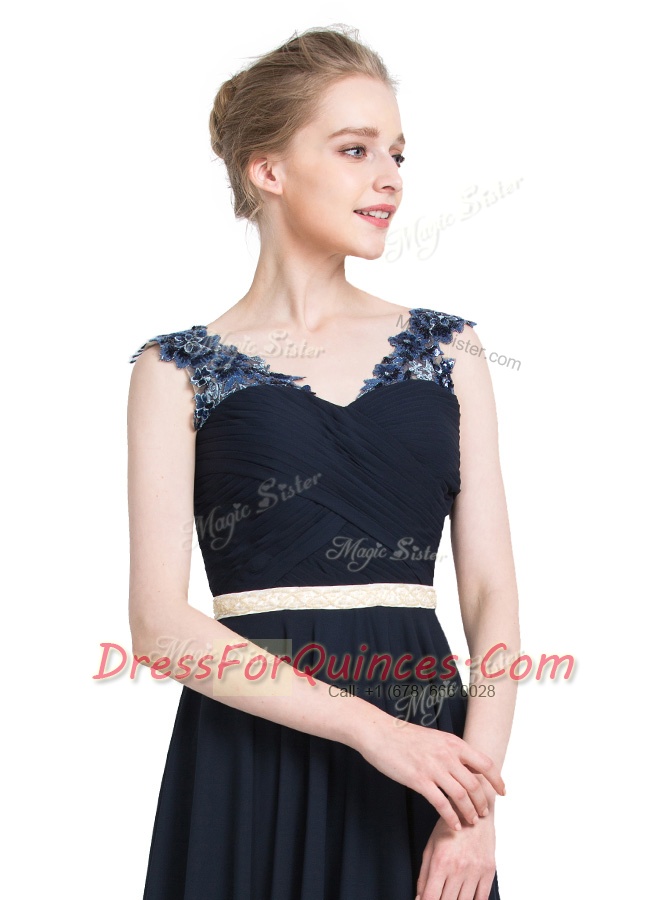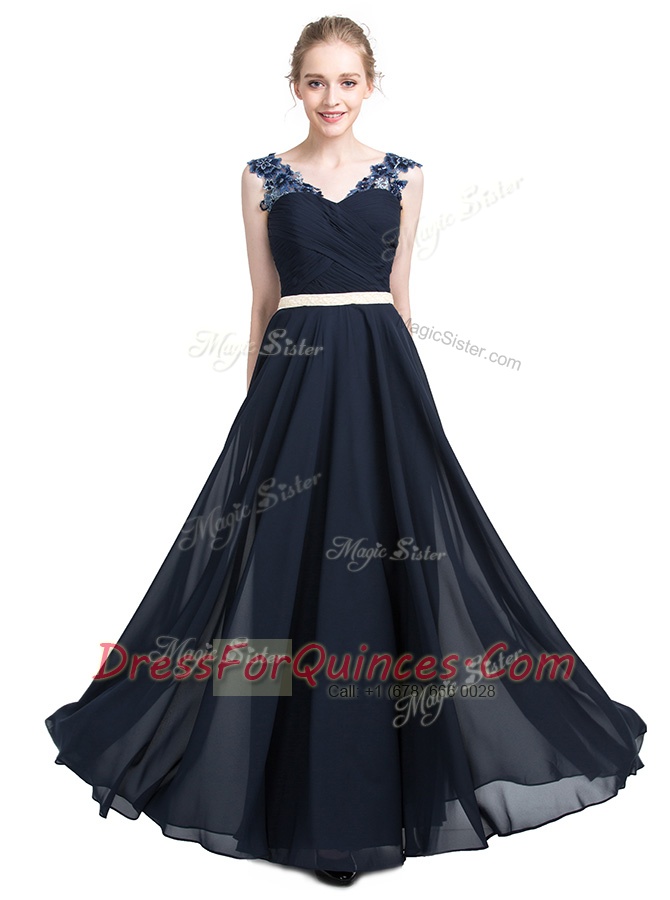 Navy Blue Prom Dresses Prom and Party and For with Beading V-neck Sleeveless Zipper