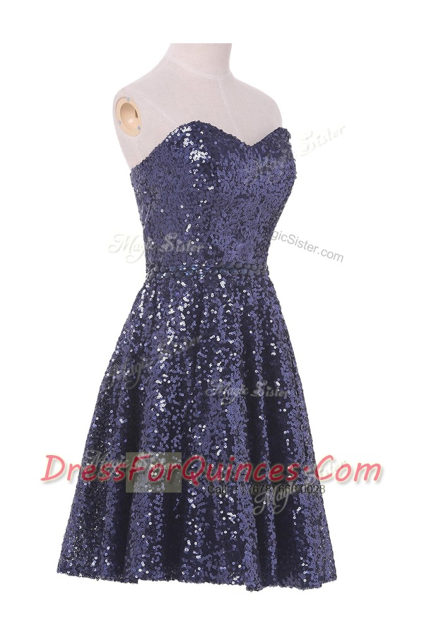 Navy Blue Sleeveless Knee Length Sequins Lace Up Prom Dress