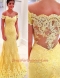 New Style Yellow Mermaid Off The Shoulder Short Sleeves Lace Brush Train Side Zipper Appliques Dress for Prom