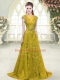 Noble Gold Prom Dresses Prom and Party with Beading and Lace and Appliques Scoop Cap Sleeves Sweep Train Zipper