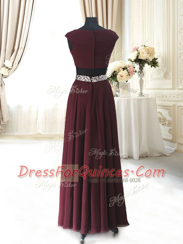 On Sale Burgundy V-neck Zipper Beading and Belt Prom Dresses Cap Sleeves