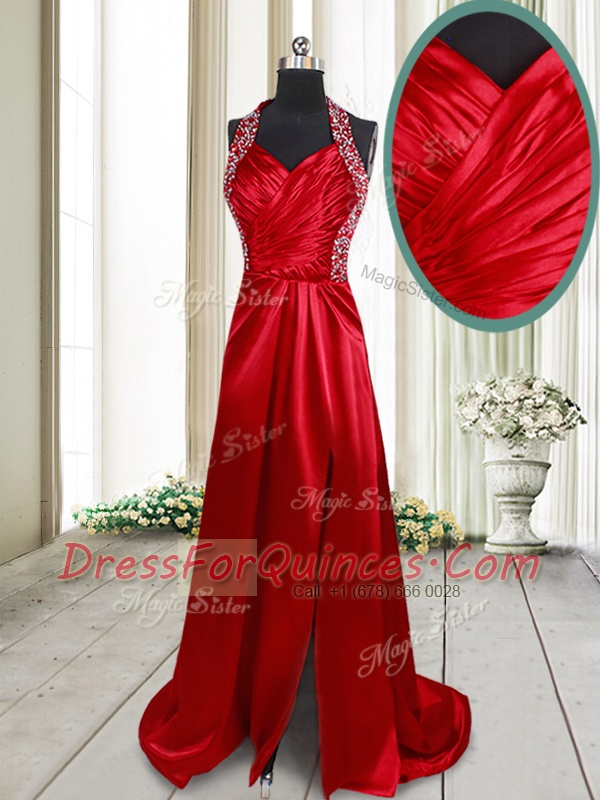Popular Halter Top Beading Prom Gown Wine Red Criss Cross Sleeveless Brush Train