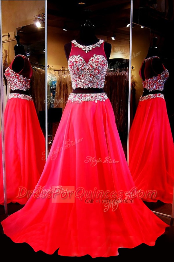 Red Prom Evening Gown Prom and Party and For with Beading Scoop Sleeveless Sweep Train Backless