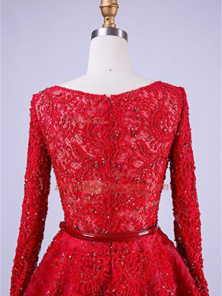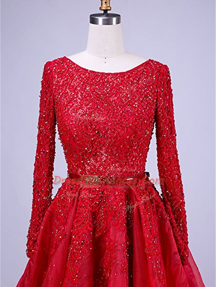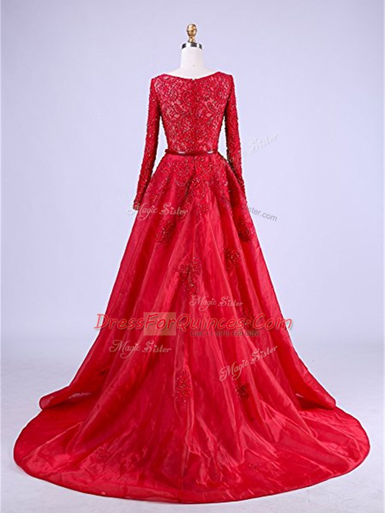 Red Prom Party Dress Scoop Long Sleeves Brush Train Zipper