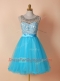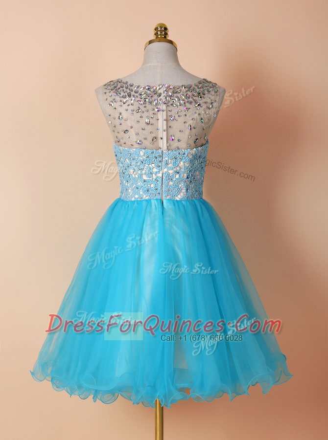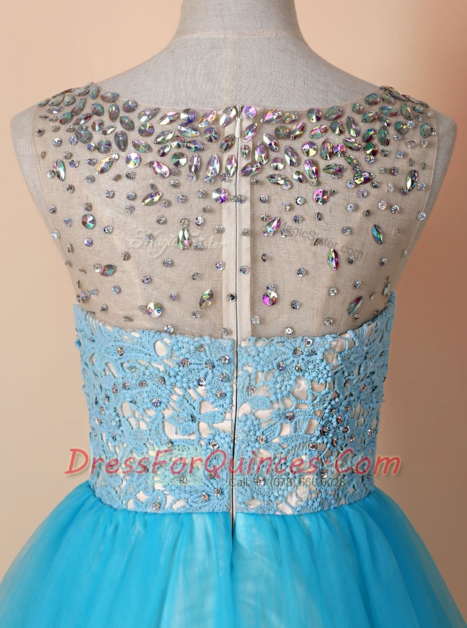 Romantic Scoop Knee Length Blue Prom Party Dress Tulle Sleeveless Beading and Lace