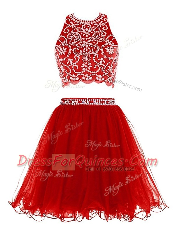 Stunning Red Empire Scoop Sleeveless Chiffon Mini Length Clasp Handle Beading Prom Gown