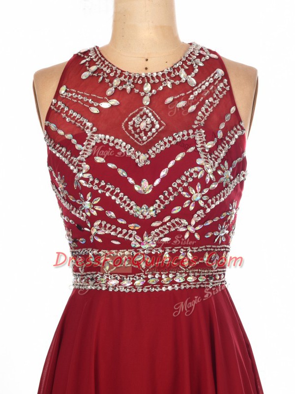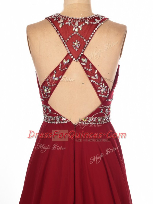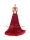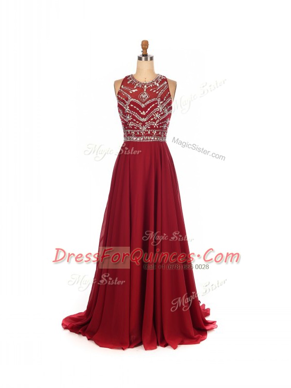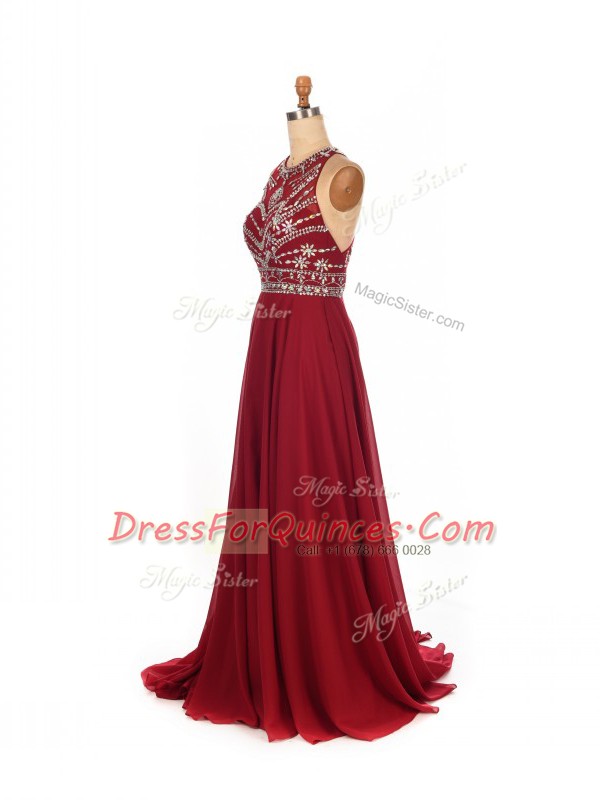 Stylish Brush Train Empire Dress for Prom Wine Red Scoop Chiffon Sleeveless Criss Cross