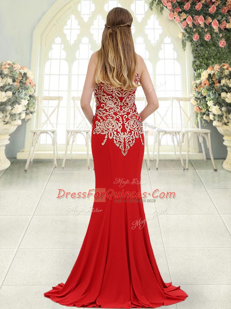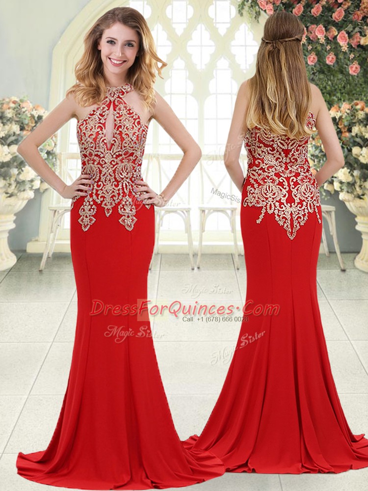 Suitable Red Mermaid Elastic Woven Satin Halter Top Sleeveless Beading and Lace Zipper Evening Dress Sweep Train
