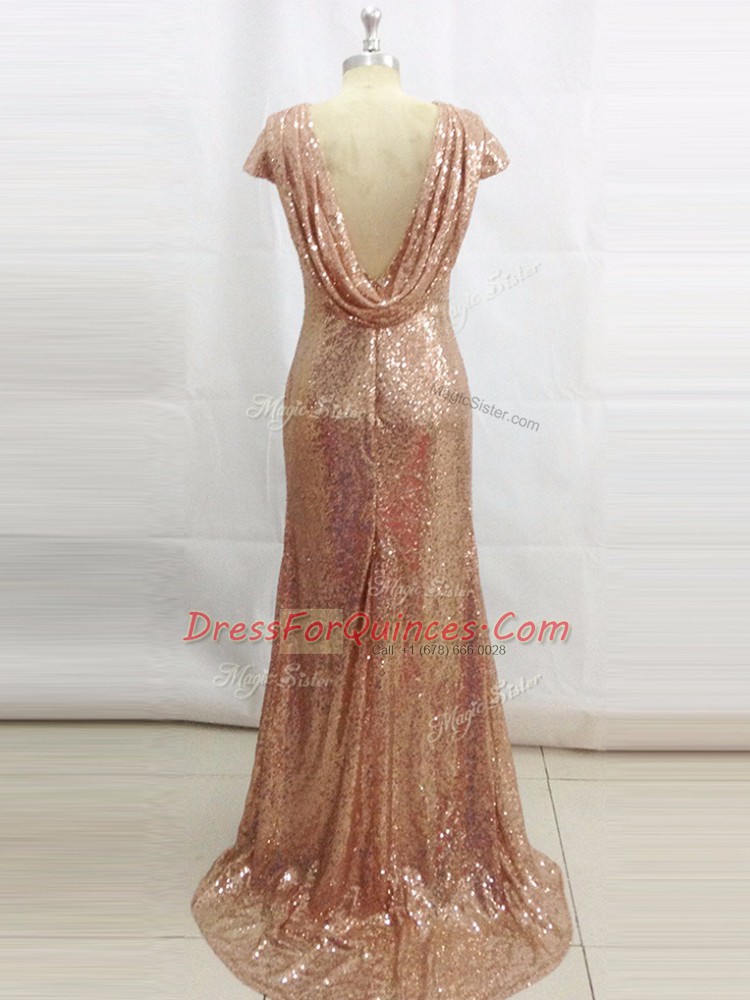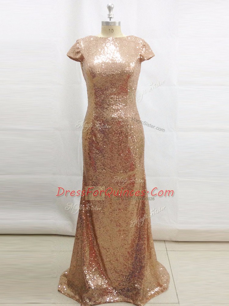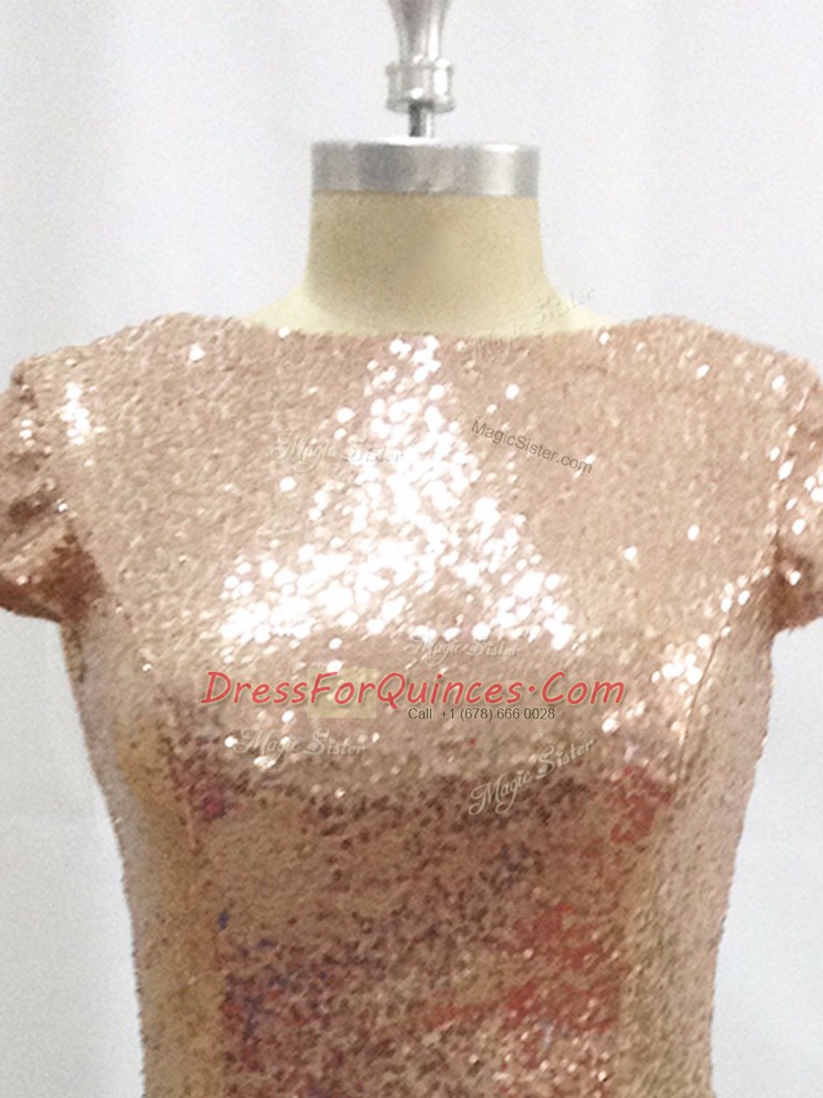 Traditional Champagne Column/Sheath Sequins Prom Gown Backless Sequined Short Sleeves