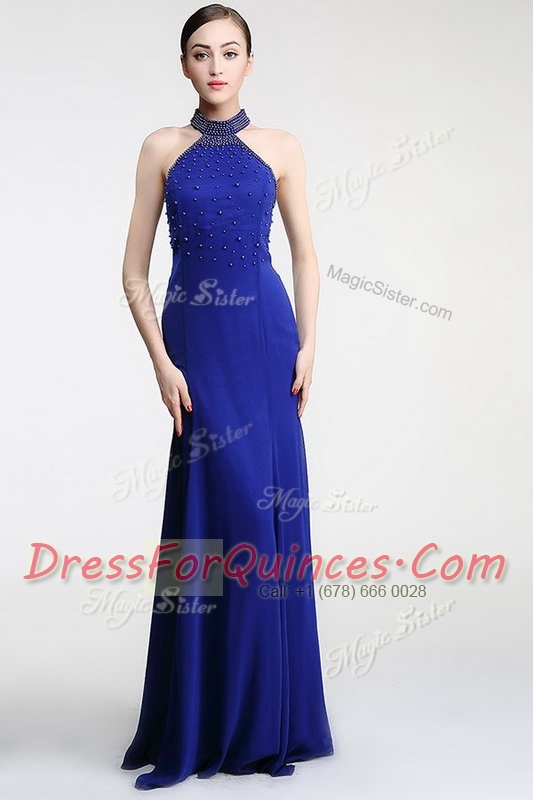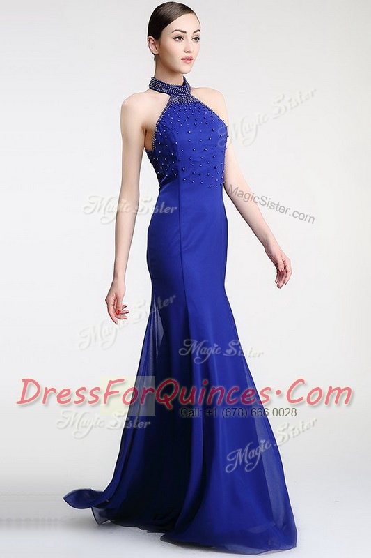 Traditional Royal Blue High-neck Zipper Lace Dress for Prom Sweep Train Sleeveless