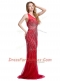 Tulle One Shoulder Sleeveless Brush Train Zipper Beading Evening Dress in Red