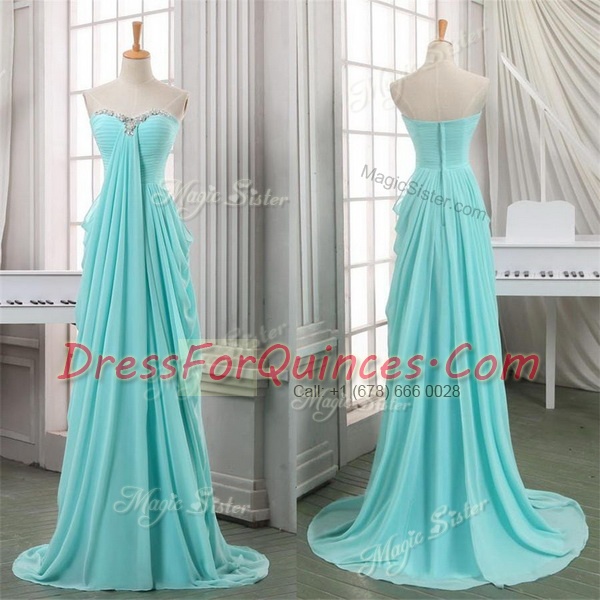 Turquoise Chiffon Zipper Prom Party Dress Sleeveless With Brush Train Ruching