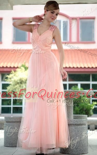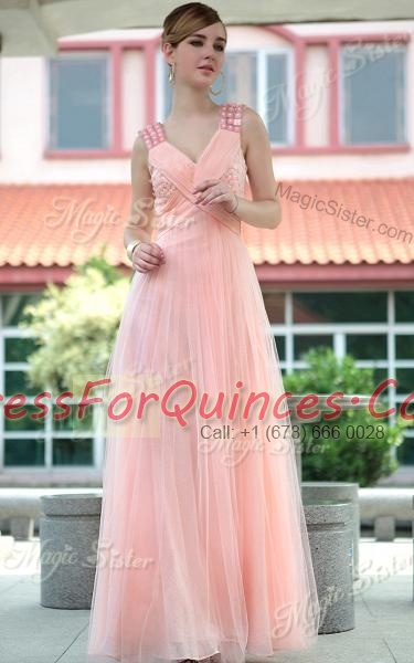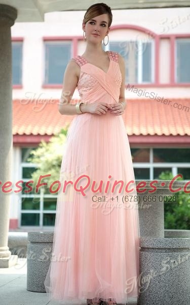 V-neck Sleeveless Dress for Prom Floor Length Beading Baby Pink Chiffon