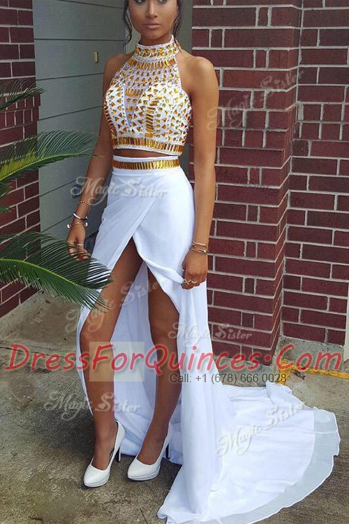 White Two Pieces Beading Prom Party Dress Zipper Elastic Woven Satin Sleeveless With Train